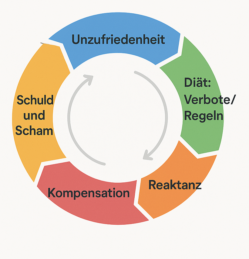 Letzlich ist jeder Phase des Teufelkreislauf eine Möglichkeit auszubrechen: Arbeite an der Unzufriedenheit in deinem Körper. Hör auf dich unter Druck zu setzen und gegen dich zu arbeiten. Hör auf eine Diät zu machen, um deine Unzufriedenheit zu lösen. Umgang mit Schuld und Scharmgefühlen und Emotionen generell.